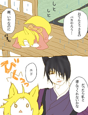 雨が降って遊べないちびちゃんが縁側でめそめそしていたら黒狐さまが慰めに来てくれたよ!ってはなしです。